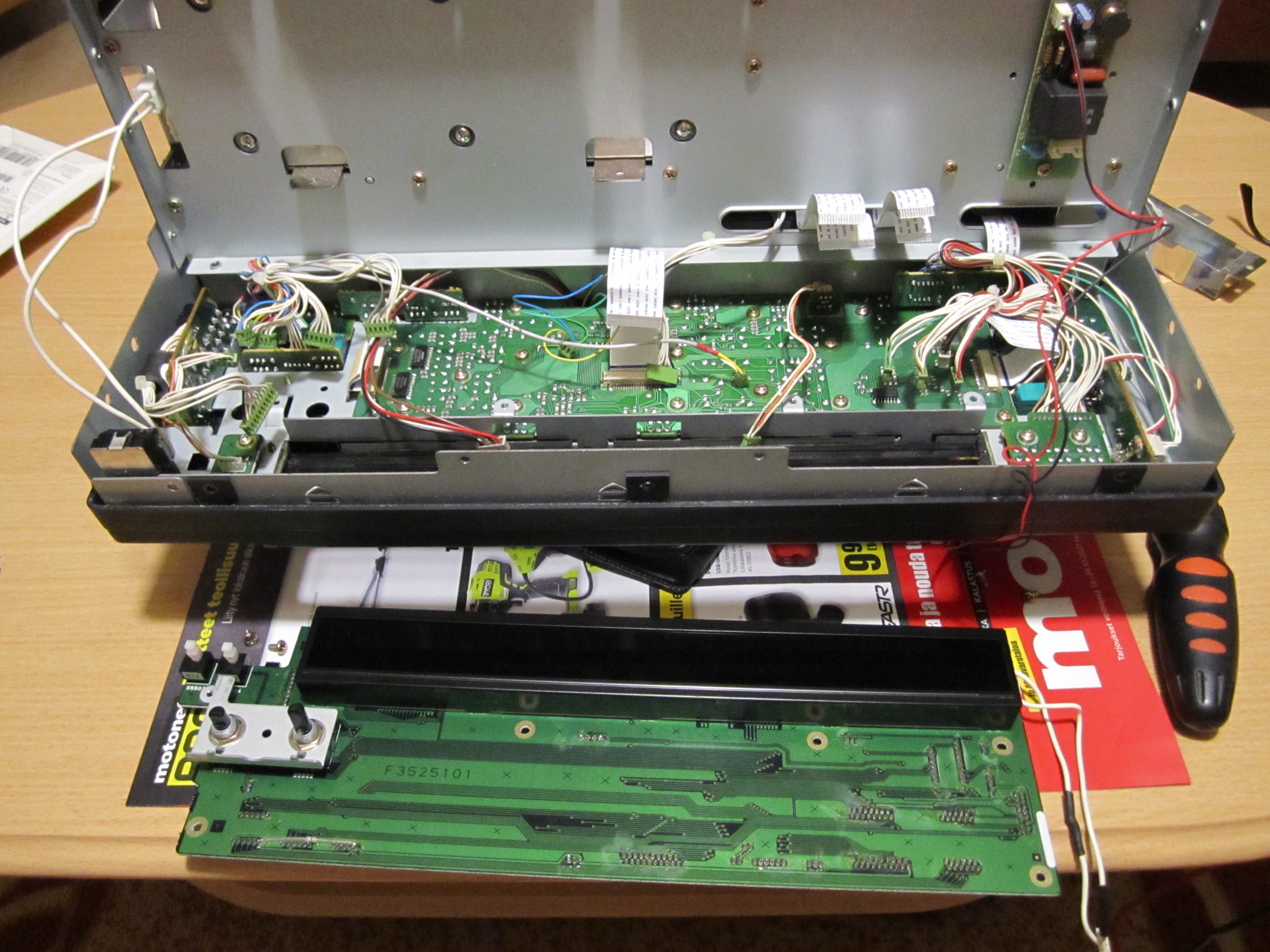 Nyt pitäs näkyä. Olen tutkinut sähköpuolen vikaa viime päivinä ja sain sen selvitettyä. Pitkällisten ja järjestelmällisten mittailujen jälkeen ilmeni, että johtosarjassa oli Ozonin saasteenalennussysteemin tarpeeton oranssi irtonainen ja liittimeltä paljas johto akun alla lytyssä oikosulussa maadoitusta vasten. Tämä pimensi mittariston ja kymppisulakkeen. Kun johdon poisti sieltä ja laittoi sulakkeen, alkoi mittaristo taas toimia. Seuraava ongelma olikin se, että nyt kun laittoi virrat päälle, alkoi starttimoottori pyörittää konetta. Ilmeni, että jarrunestesäiliön anturilla pystyi ohjaamaan starttia virrat päällä. Kun anturi kytki, syttyi sen varoitusvalo ja lada alkoi startata. Tutkin asiaa lisää ja kävi ilmi, että jostain syystä virtalukon liittimeltä 50 eli startin herätteeltä lähtee ohut punainen johto kohti varoitusvalopaneelia ja se yhdistyy jarrunestemäärän varoitusvaloon diodin kautta. Tuo diodi on kytketty siten, että virta ei pitäisi päästä kulkemaan kohti liitintä 50 ja aiheuttamaan starttausta. Kuitenkin kyseinen diodi oli kaikesta päätellen hajonnut ja muodosti 160 ohmin vastuksen ja päästi virran menemään kohti startin herätettä. Tuo virta riitti kytkemään startin apureleen. Korjauksena oli se, että katkaisin tuon virtapiirin liittimeltä 50 diodille. 50-liittimen punainen ohut johto tulee ryhmäliittimeen mittariston taakse ja siitä se muuttuu ruskeaksi, joka menee diodille. Otin mittariston takaa liittimestä ruskean johdon irti ryhmäliittimestä ja laitoin sen viereiseen tyhjään paikkaan, koska kyseisessä ryhmäliittimessä oli tilaa. Näin virtapiiri katkesi ja jarrunesteen varovalo toimii edelleen oikein, koska saahan se ohjauksensa edelleen anturilta. Jos tuo diodi olisi ehjä, palaisi startatessa jarrunesteen varoitusvalo. Muistaakseni ensimmäisessä Ladassani tuo valo paloikin startatessa. Miksi tuo on kytketty tuolla lailla, jää minulle epäselväksi. 2105:n kytkentäkaavioissakin näkyy tuo samainen kytkentä. Mitä tekemistä on jarrunesteen varoitusvalolla starttaamisen kanssa, jää ainakin minulle mysteeriksi. Mutta nyt kuitenkin sähköt toimivat oikein.
