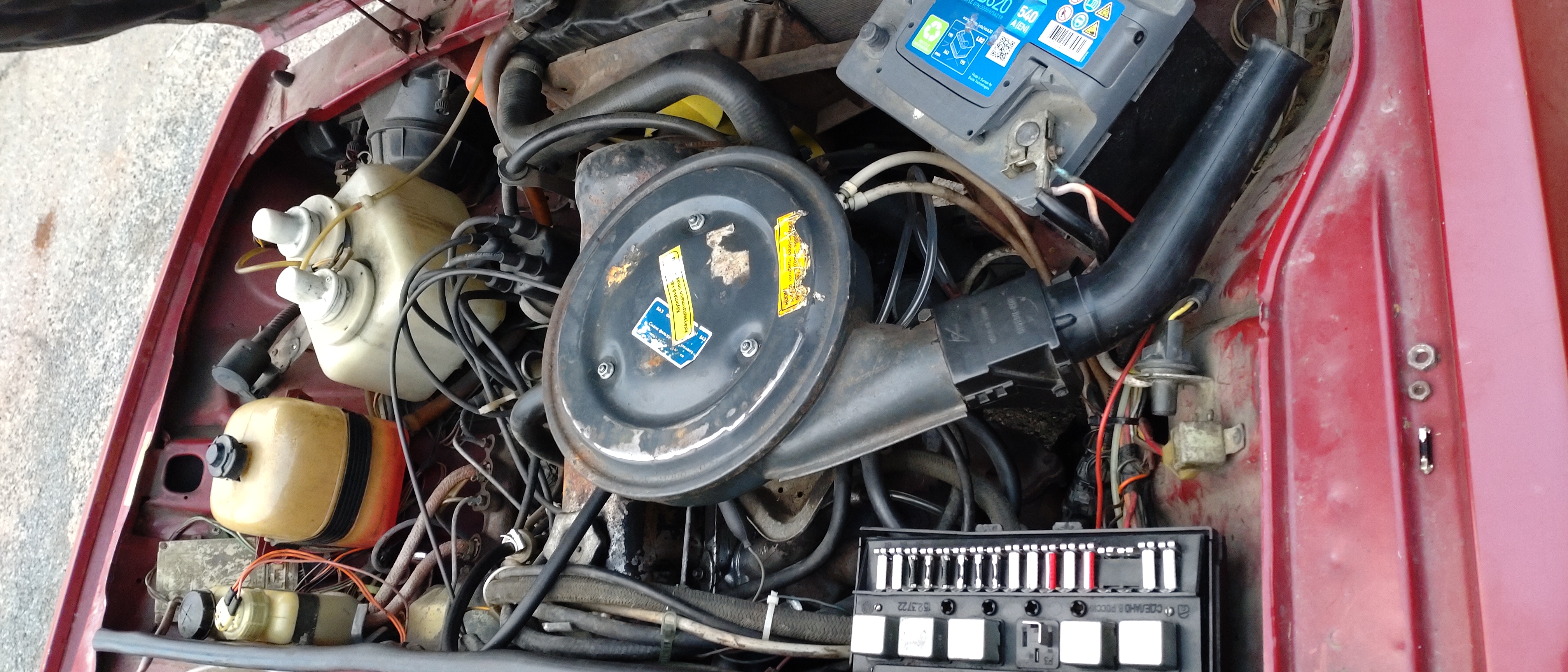 Tekniikka on muuten mainion oloista, mutta Ladassa oli mittaristo pimeänä ja kymppisulake paloi koko ajan. Lisäksi siihen oli vaihdettu axteckin tilalle Samaratyylinen takavedon Solex. Onneksi Axtec-kaasari oli takakontissa mukana. Jarrut tarvitsivat hieman huomiota sekä muutama pieni reikä pitää paikata. Pakoputkea pitää justeerata oikeaan asentoon ja tässä on jostain syystä Combin takapönttö. Muuten tämä on erittäin tervekorinen ja vaikuttaa napakalta. Konetilassa on muuten joku omituinen liitin. Osaako joku kertoa, mikä se voisi olla? Se näkyy yhdessä kuvassa.