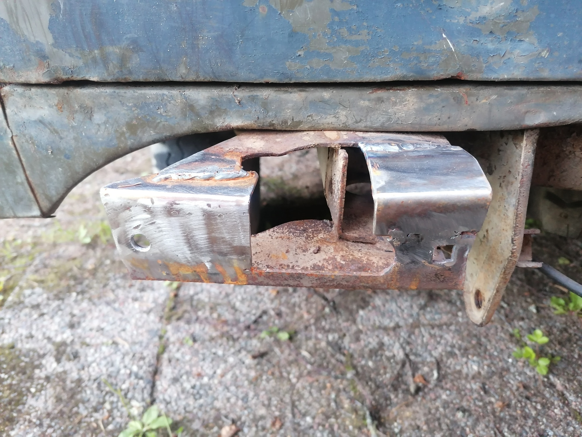 Ensitestailut maastossa vinssi läpäisi ja vinssin kiinnityskin kesti hyvin rungossa. Mutta pitkään ei vinssattu kerrallaan kun sähkö loppuu kesken, eli isompaa akkua selvästikin kaipaisi. Vinssin paikan etsimistä, aika lähellä takana oleva jarrupääsylinteri toi oman hankaluutensa, Johonkinhan se vinssipeti pitää kiinnittää, joten laitoin runkoaisojen väliin 5mm paksun levyn johon tein vähän vahvikkeita (kuvausvaiheessa ne näköjään vielä puuttuvat) sekä tietty hitsasin pikakiinnitystä varten 60x60x4 neliöputken, oikeastihan putkikoon pitäisi olla jotain tuumaista mitä jenkkiautojen vetokoukuissa käytetään mutta eihän sellaista putkea mistään saa. Tuon levyn laitoin pulttaamalla runkoaisoihin kiinni, kun jarrupääsylinterin kiinnityspultteja pystyi hyödyntämään kiinnityksessä. Apukuskin puolelle tarvitsi aisaan hitsata pieni lappu pulttikiinnitystä varten. Samalla sai vahvistettua sen puolen hinauskoukkua, kun se jo kertaalleen pääsi vääntymään. Kuskin puolellahan se on tehty vahvemmaksi ettei jarrupääsylinteri irtoa missään tilanteessa.