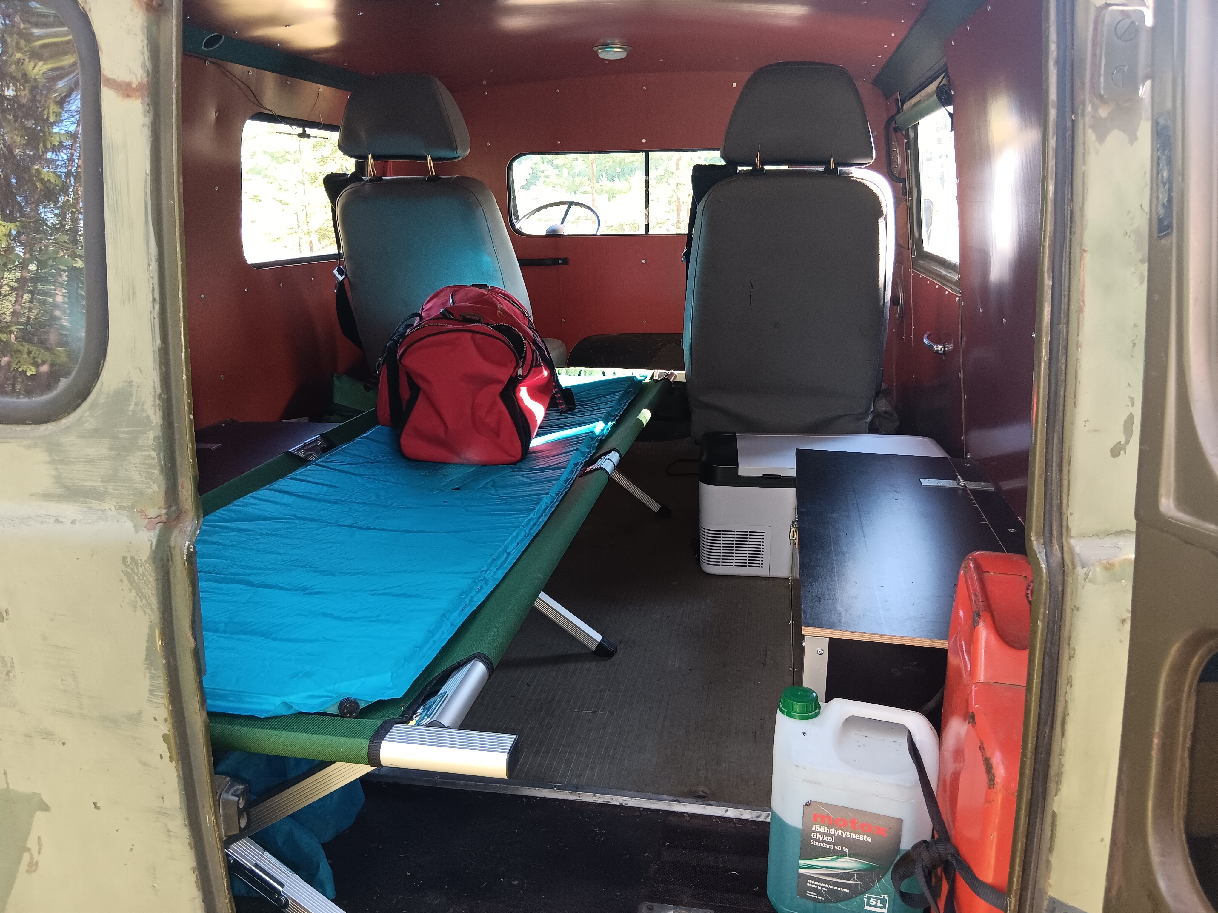 Armeijassa käytetty jotain yleismallisia huoltokirjan pohjia, joihin on sitten liimattu lapuilla merkkikohtaista lisätietoa ja nyt kylmäkäynnistysohje irtosi. Ollut paperikin kallista kun pitänyt karttojen taustapuolia käyttää tähän tarkoitukseen. Pari viikkoa sitten nukuin ensimmäistä kertaa tänä vuonna Uazissa ja samalla tuli testattua tuo retkisänky ja kompurajääkaappikin. Juuri mahtuu tuohon lattialle sängyn levittämään, eli siinä mielessä hyvin osui noiden penkkien sijainti kohdilleen. Pitkään pähkäilin että mistä kuskin jaloille puhaltaa kylmää ilmaa mutta sehän oli sitten niinkin näkyvällä paikalla kuin käsijarrukahvan suojakumin puuttuminen. Nyt on sitten uusi kumi siinä ja taas talvea ajatellen aavistuksen lämpimämpi ajella. Tässä syksyn mittaan kun maasto käy märäksi niin tein hankintoja, eli ostin 4500kg kiinalaisen vinssin. Vähän siinä ja siinä että olisiko pitänyt olla pykälää isompi kahden tonnin painoisen Uazin kiskomiseen mutta alkaa hinnat karkaamaan käsistä, etenkin kun yksi offroadharrastaja vielä sanoi että ota köysiversio vaijerin sijaan. No tämä on vielä asentamatta paikalleen.