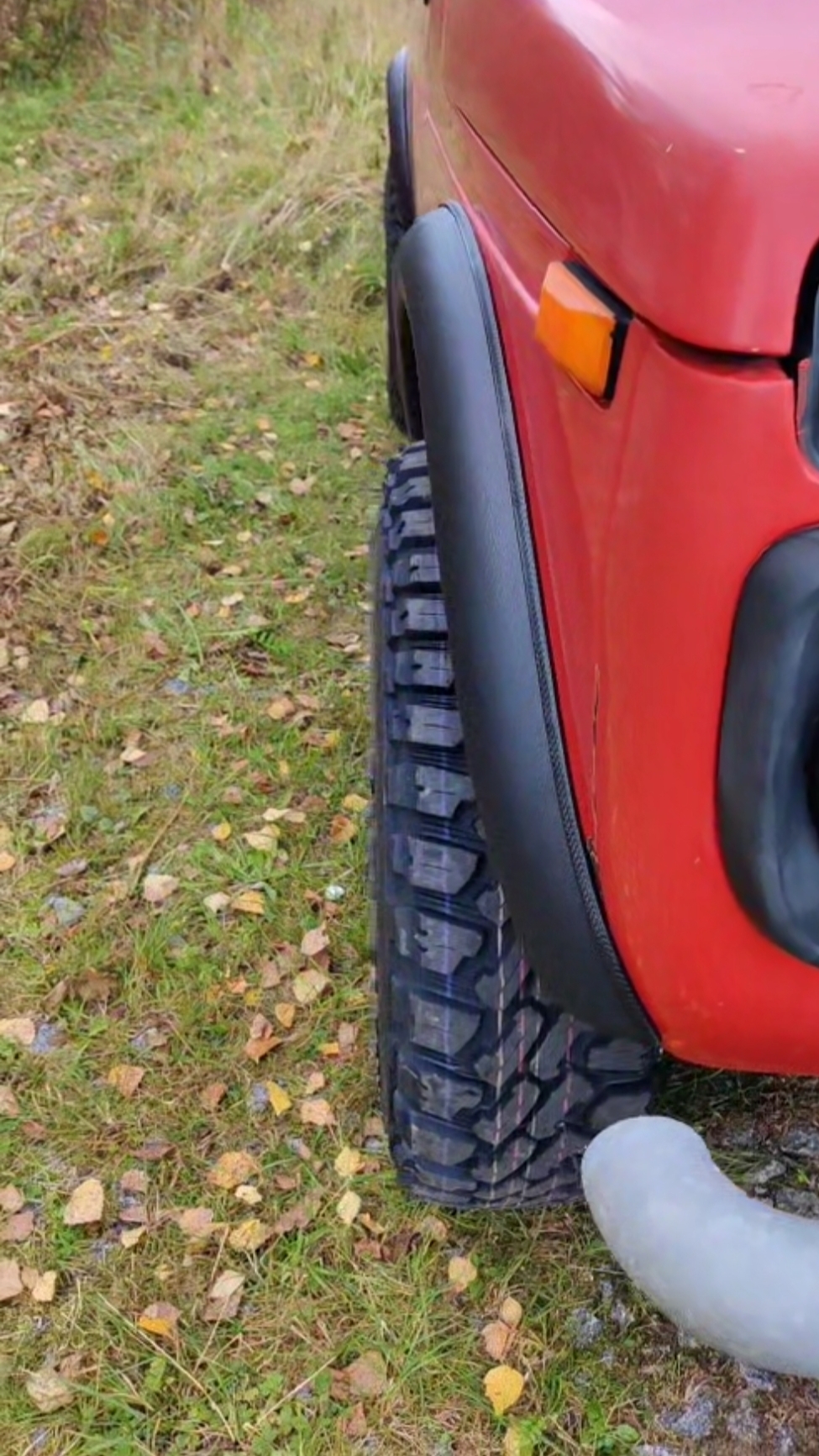 Ja taas on aikaa kulunut, pistetään pari kuvaa nyt kun rengastusta saatu muutettua mieleisemmäksi. Vanteiksi löytyi tuommoset 15" noin 0ET vanteet 7" leveänä. Kunto oli aika karu, joten hiekkapuhallettu ja maalattu uudelleen puolikiiltäväksi. Renkaina Nankang FT-9 koossa 215/75R15. Istuu aika asiallisesti omasta mielestä levikkeiden kanssa. Vähän meinaa hipsiä eteen alareunaan käännettäessä enempi, mutta siihenkin löytyy lääke jahka jaksaa alkaa korottaa