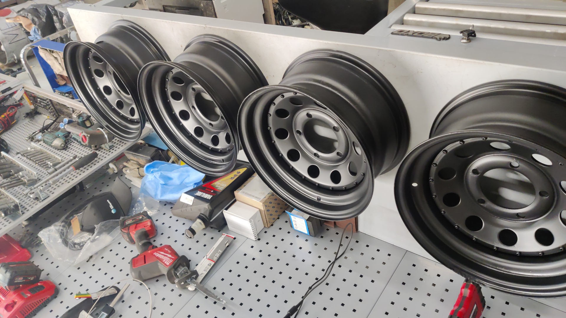 Ja taas on aikaa kulunut, pistetään pari kuvaa nyt kun rengastusta saatu muutettua mieleisemmäksi. Vanteiksi löytyi tuommoset 15" noin 0ET vanteet 7" leveänä. Kunto oli aika karu, joten hiekkapuhallettu ja maalattu uudelleen puolikiiltäväksi. Renkaina Nankang FT-9 koossa 215/75R15. Istuu aika asiallisesti omasta mielestä levikkeiden kanssa. Vähän meinaa hipsiä eteen alareunaan käännettäessä enempi, mutta siihenkin löytyy lääke jahka jaksaa alkaa korottaa😄