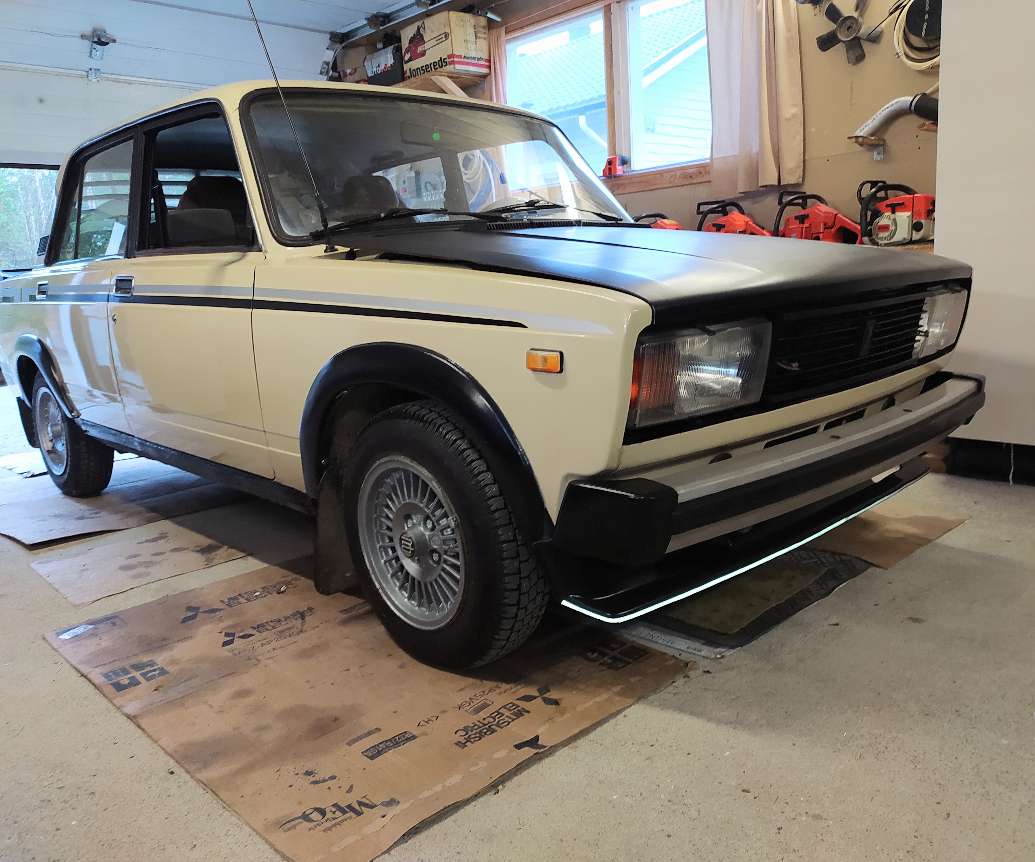 terve! kiitoskia kommentista. joo emmää kyllä puskureita irroita,pitäähän nyt lada näyttää suunnilleen laatikko ladalta vaikka tuossa tuo etulippa tulikin laitettua 3 ruuvilla kiinni.