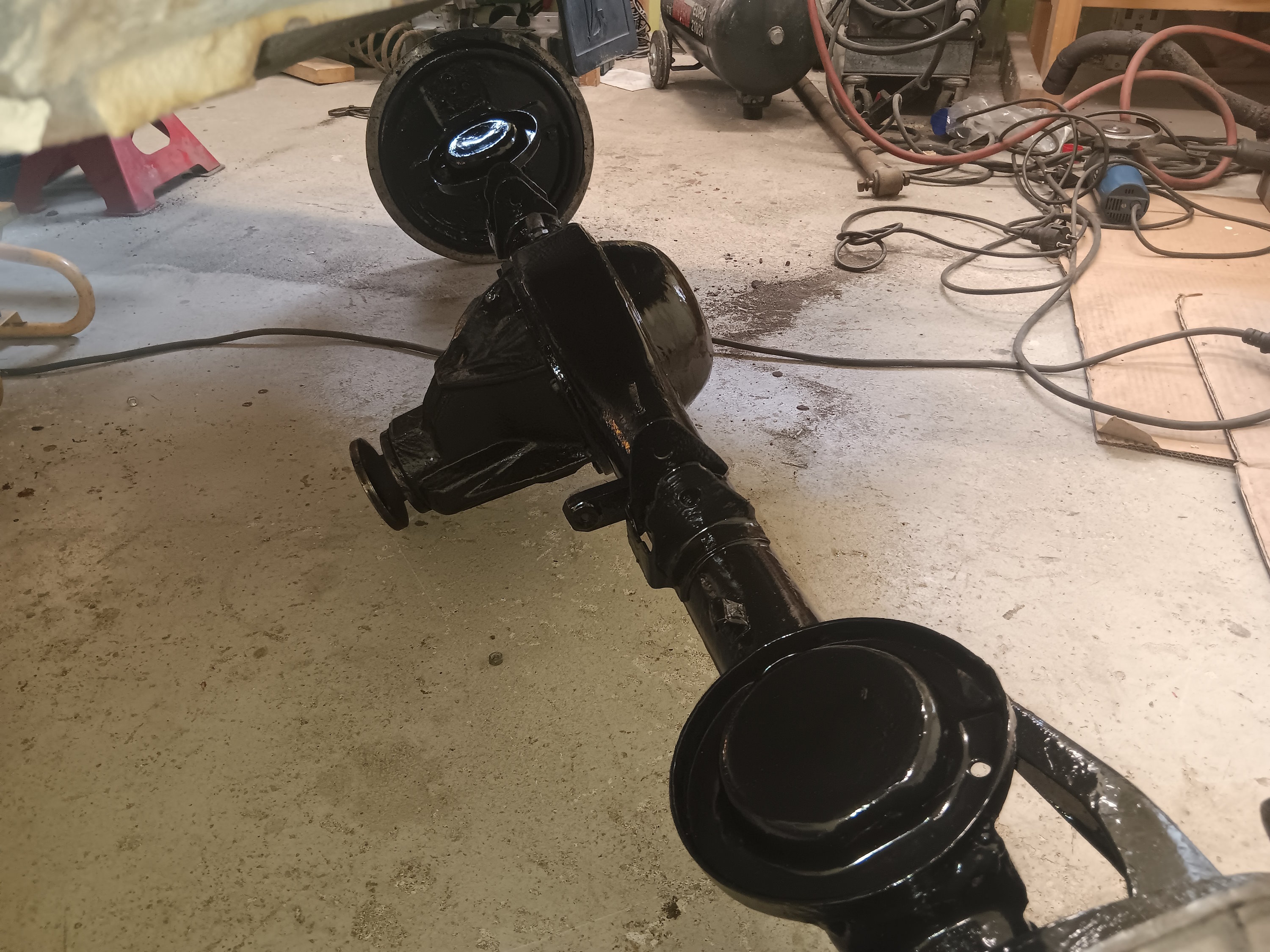 Leimalla oli muuten kaikki kunnossa mutta taka-akselin jousilautasista tuli hylky. Uudet korjauspalat oli aiemmin tullut ostettuakin ja ne oli äkkiä hitsattu mutta remontti venyi kun päädyin maalaamaan koko akselin, pistetään muistiin tulevaa varten että RAL9004 tumman harmaalla maalilla maalasin ja mun mielestä tuli aika hyvän värinen, tosin pensselillä sutien ei mikään tasainen maalipinta tullut. ja homma venyi entisestään kun päätin uusia taka-akselin päällä kulkevat jarruputket ja jostain syystä ei meinannut tulla pitävää liitosta t-haaraan sitten mitenkään. Mutta kyllä se sitten lopulta alkoi pitämään kun tarpeeksi kiristi.