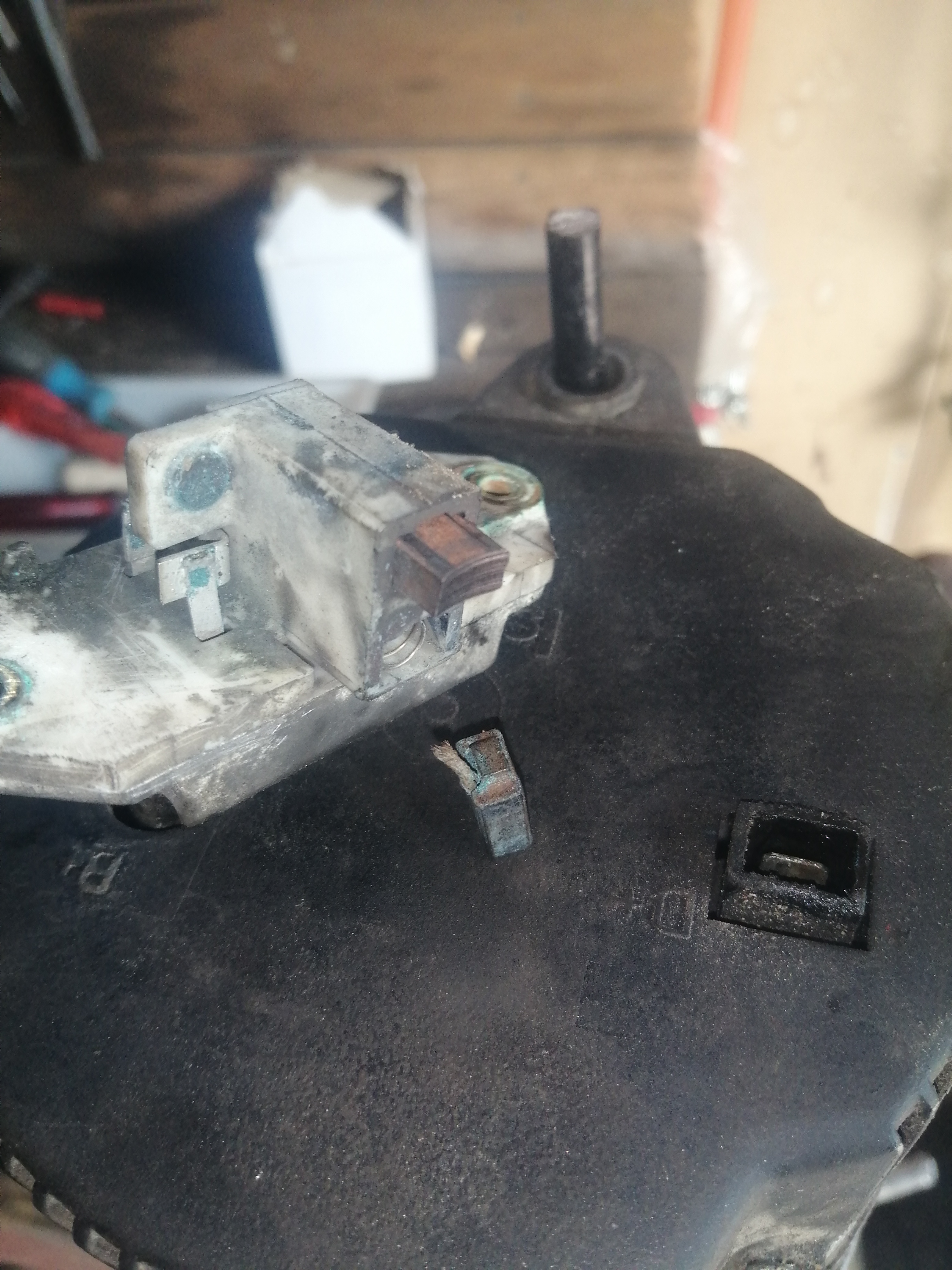Laturin kun sai irti ja purettua niin hapettumahan sinne oli iskenyt. Hapettumaa oli säätimen liittimissä mutta myös toisen hiilen punos oli hapettunut tuhkaksi ja kun siihen koski niin pätkä katosi. Eli ilmeisesti talviteloille ajaessa on vielä jousen kautta yhdistänyt ja ladannut vähän. No laturi on nyt irti ja pitää hiilet hommata ja vaihtaa. Ensiviikolla jos/kun saa hiilet niin pitäisi ehtiä testaamaan paikalleen että toimiiko. Ellei niin alkaa tulemaan kiire ratapäiville, kun työ ja muu elämä asettaa rajoitukset ja etäisyys tallin ja asunnon välillä.