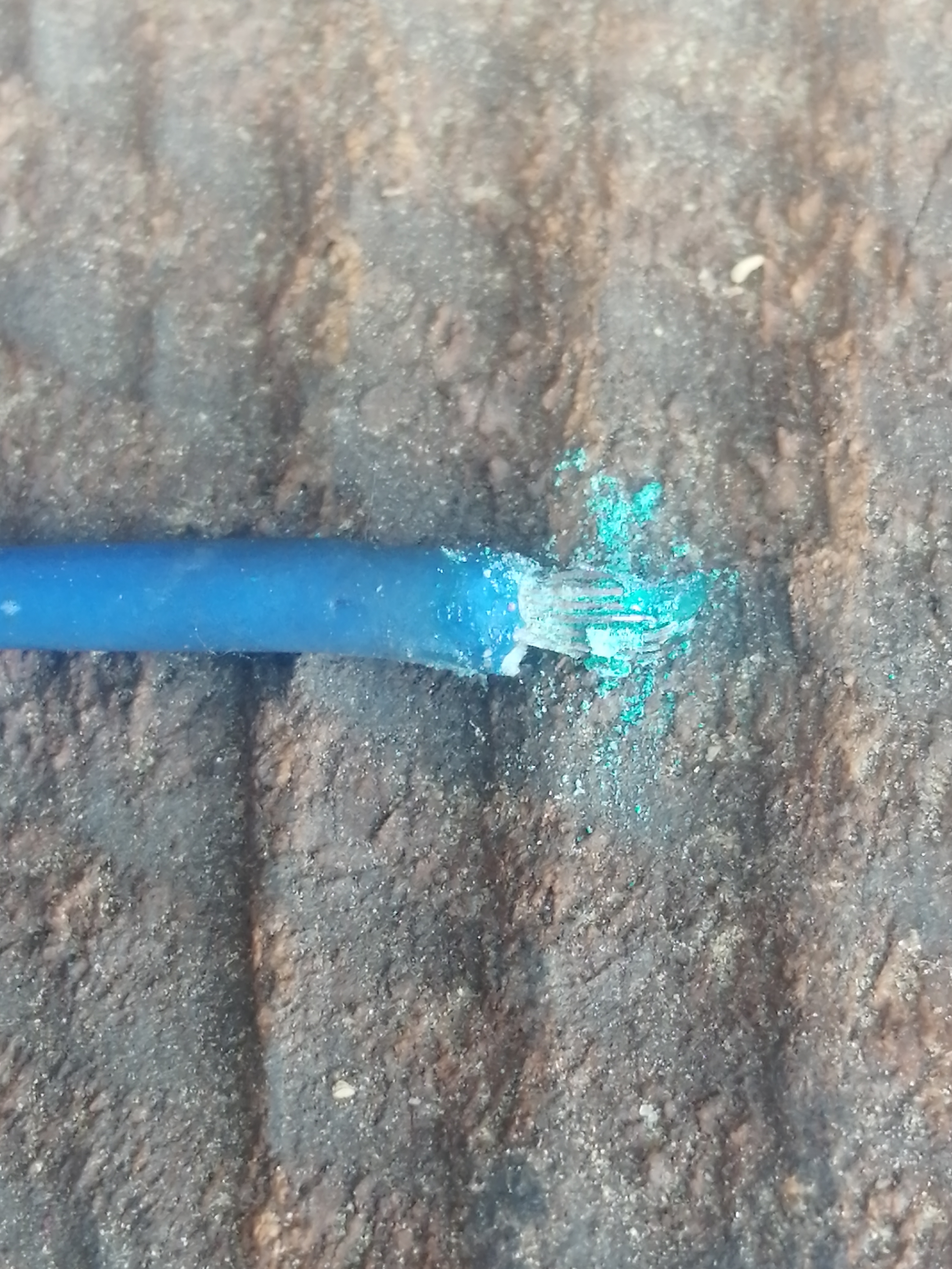 Laturia päästy sipistelemään. Hiili vaihdettu ja hiilen jousta (joka oli sulanut pitimeen) venytetty. Näiden toimenpiteiden jälkeen testattu ettei lataa. Lisää mittauksia ja todettiin herätevirtaliittimen johto hapettuneen myös poikki, siis laturin sisällä oleva. Johto näytti olevan hyvin paikallaan mutta kun sitä väänsi niin irtosi ja kuoriessa paljastui puolisenttiä vain vihreää tuhkaa...