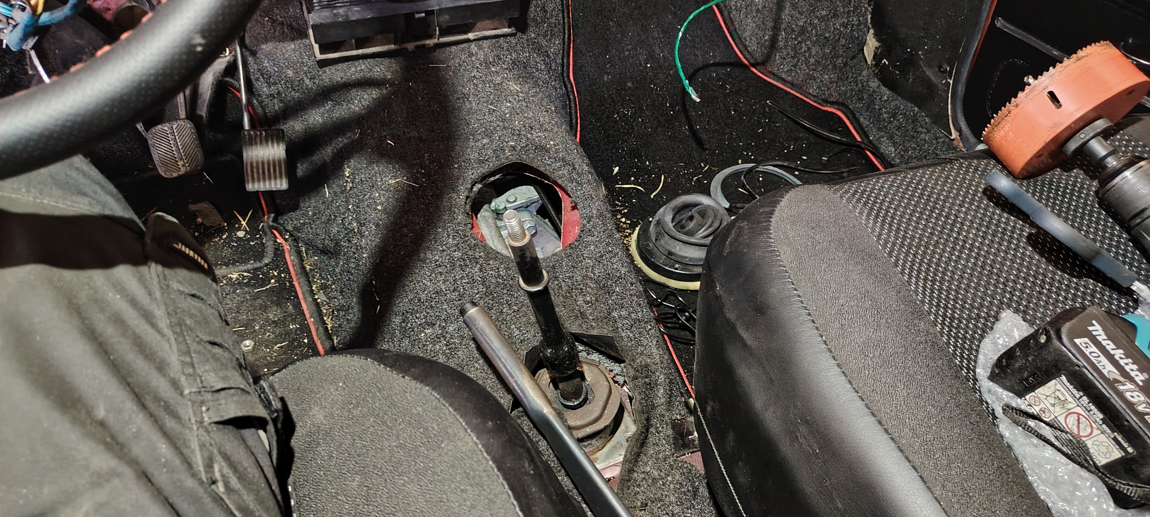 Kone tulee 3cm apukuskin puolelle päin ja rupesin mittailemaan linjauksia. Näyttäs että kardaanitunneli ja kone/loota alunperinki on sen 2cm apukuskin puolella, eli ei sen puoleen mitään hätää. Porasin reikäsahalla vaihdekepin reiän pikkasen enemmän apukuskin puolelle, että saa tekniikkapaketin mahollisimman suoraan. Reikä tuli sentin liian taakse, kun oli aika hankala hahmottaa paikkaa, vaan eipä tuo haittaa....
