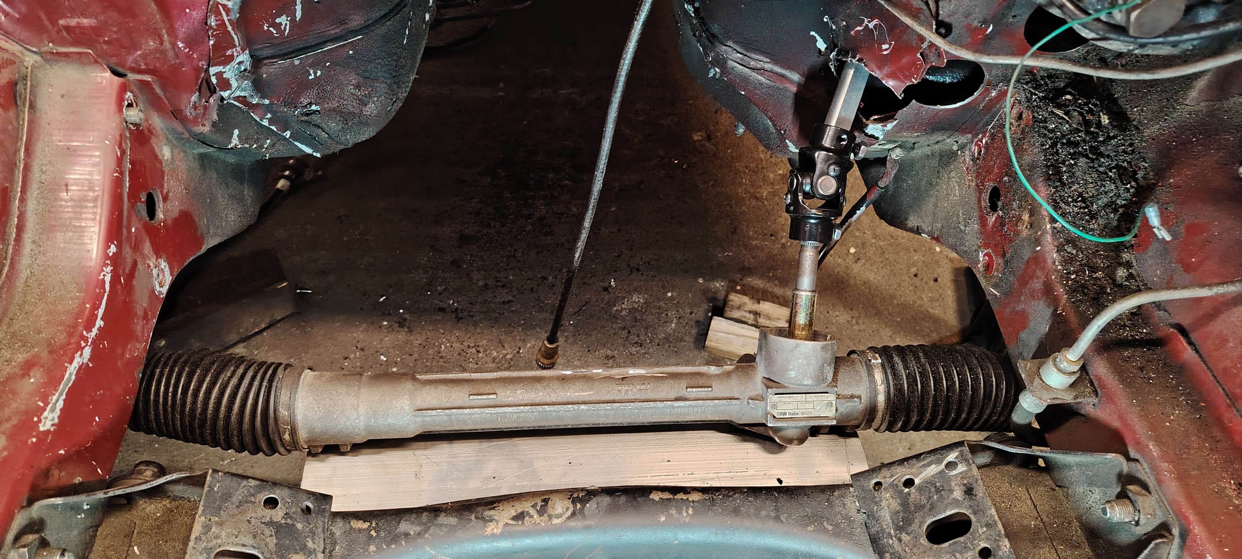 Hammastankoon löysin tuollasen mustangin tarvike ohjausakseli sarjan, siinä oli käypänen boori hammastankoon. Ohjausakselin paikka valikoitui nyt tuohon kaasupolkimen kohalle ja menee siitä jarrupolkimen yli rattiakselille järkevässä kulmassa.