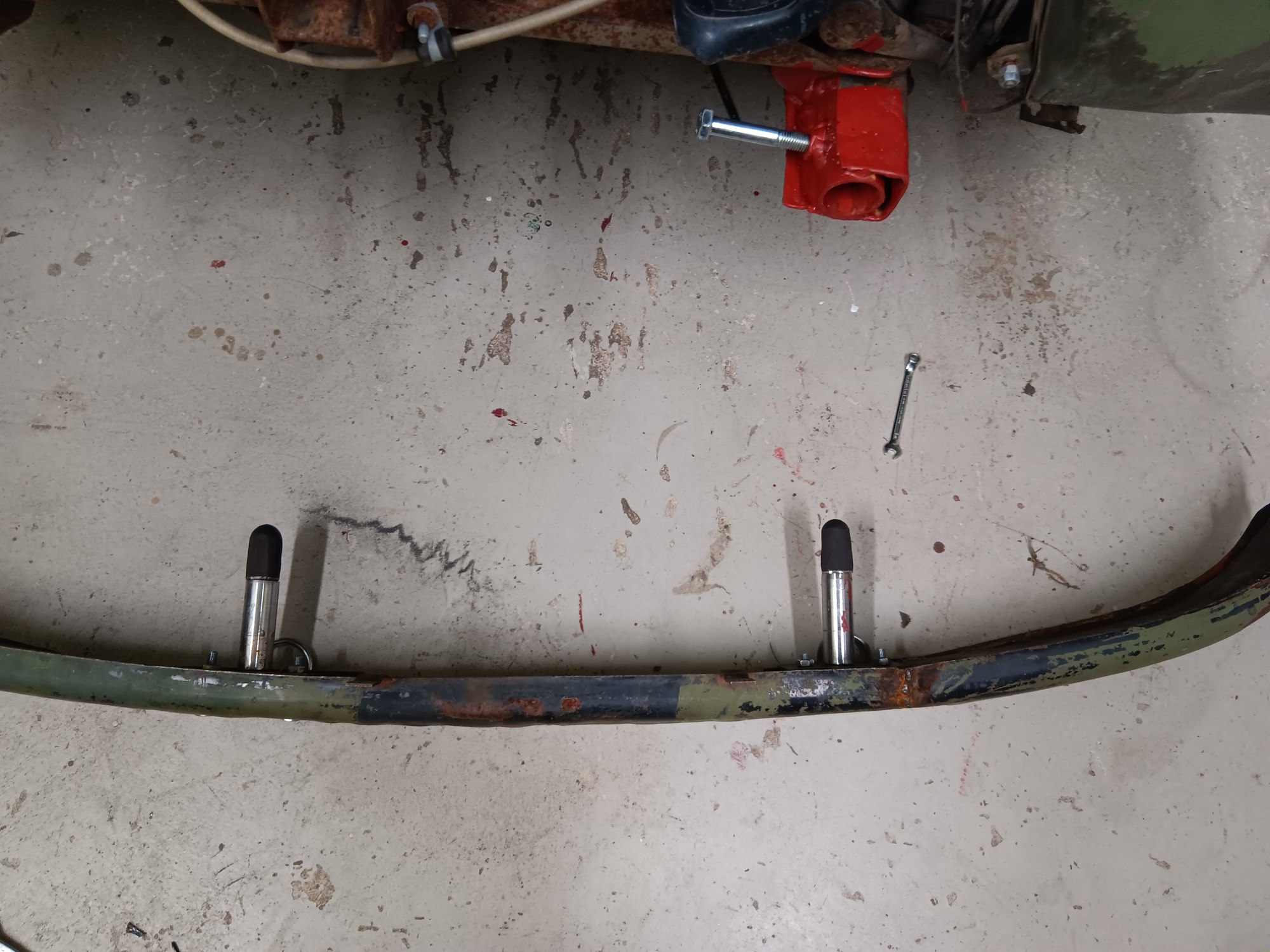 Matkin kanttilamppujen puskurinkiinnitystä ja tein puskuriin tuollaiset tapit joiden päässä on pohjaanlyöntikumit joustona. Runkoaisan päästä rälläköin orkkis kiinnityspisteet pois ja runkoaisojen sisälle hitsasin putket joiden päät on hitsattu umpeen että on jotain mihin nuo pohjaanlyöntikumit toppaa. Putken kylkeen hitsasin M12 mutterin missä vielä toistaiseksi pultti painattaa puskurin tappiin mutta sehän ajanmittaan löystyy jos ja kun puskuri liikkuu edestakaisin ja lopulta putoaa taas koko puskuri. Eli pitää jyrsiä joku ura tuohon tappiin, että puskuri pääsee vapaasti liikkumaan edestakaisin ja pultti toimii topparina estäen puskurin ulospäintulemisen. Näin prototyyppivaiheessa sattui jäämään noin 3-4cm liikkumavaraa minkä verran puskuri pääsee painumaan sisäänpäin mutta pitää tuota säätää lyhyemmäksi, kun nyt on jo ruman kaukana puskuri ja ei varmaan leimasetäkään tykkää jos autoa pidentää. Sen verran kokeilin että käynnistyskampi on riittävän pitkä mutta sehän ei käy enää paikalleen. Säädin puskuriakin ylöspäin mutta ei siltikään ihan mene kampi perille asti. Lopulta otin puskurin irti ja ei siltikään mene kampi perille. Eipä ole moottorikannakkeiden teon jälkeen tullut kampea kokeiltua. Luultavastihan se moottori on oikealla korkeudella nyt, mutta tuo vinssipeti on tehty aiemmin ja siihen se kampi nyt ottaa kiinni, eli seuraavaksi alettava sitäkin rälläköimään uuteen muotoon.