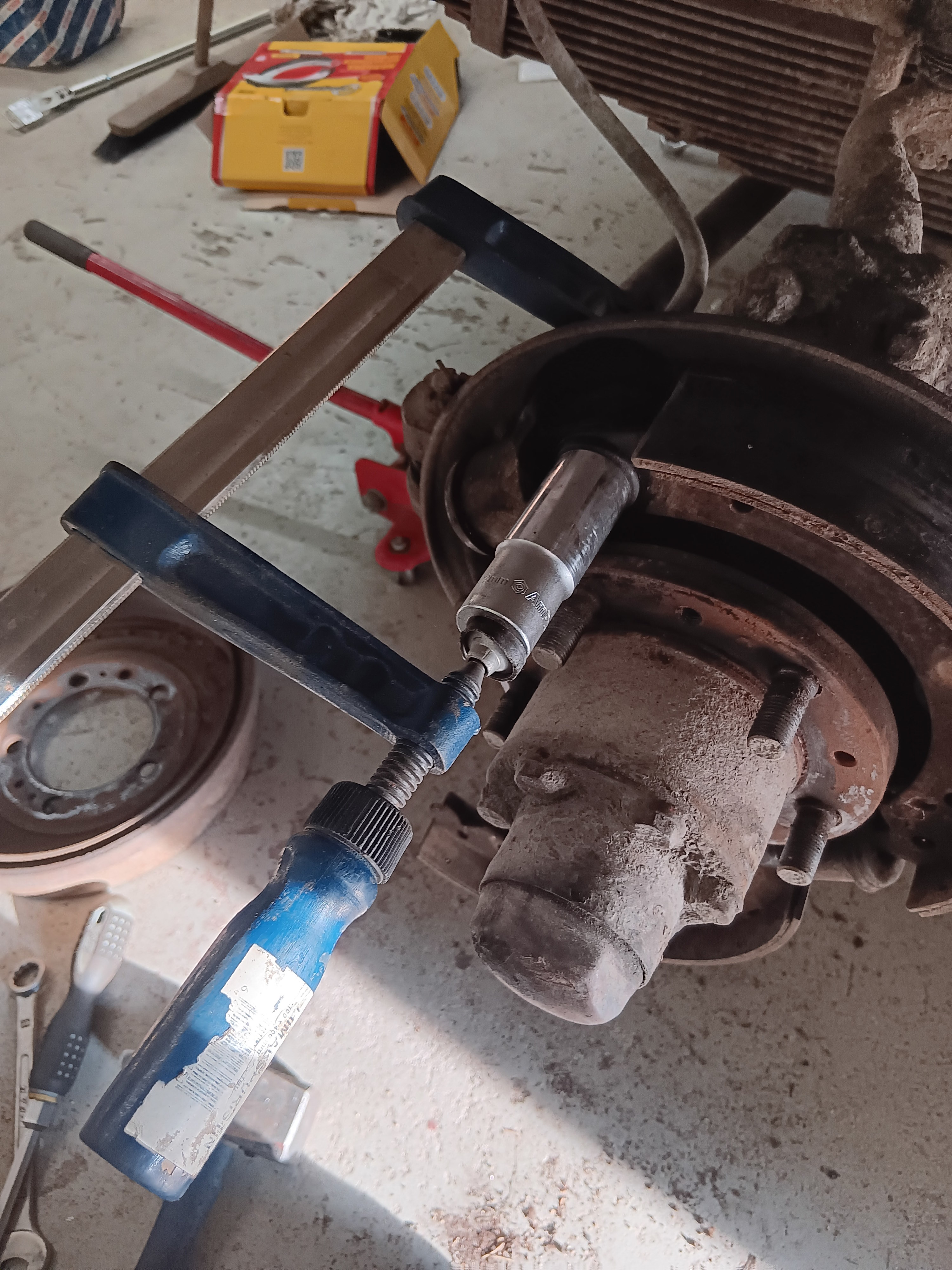 Maassa sitten halkaistiin taka-akseli. Kahta pulttia lukuunottamatta oli läpipultit ja toki toinen pulteista katkesi. Onneksi niin että kun akseli oli katkaistu niin jämää oli sentti näkyvillä ja se induktiokuumentimella punaiseksi niin lähti jämä irti.