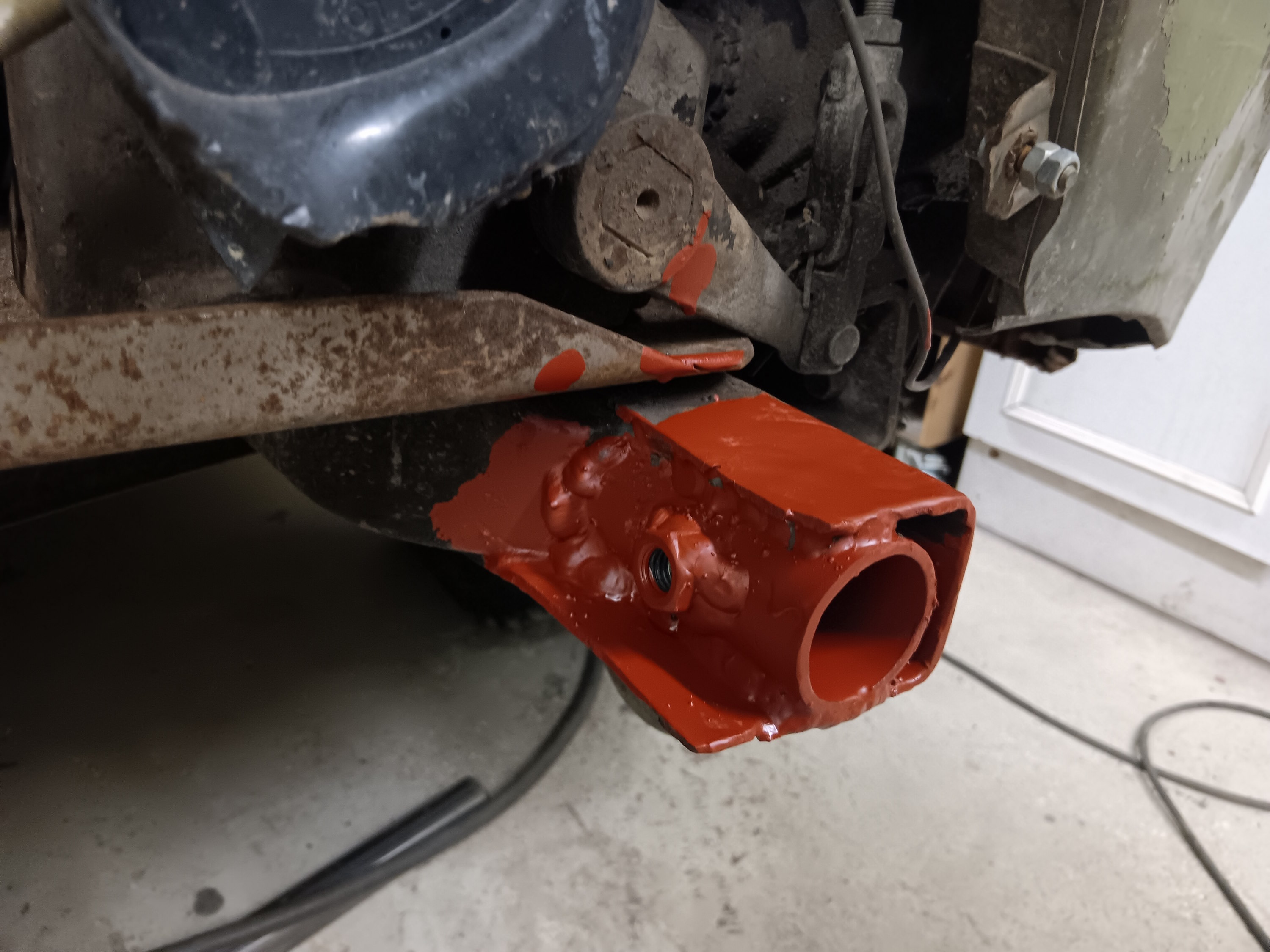 Matkin kanttilamppujen puskurinkiinnitystä ja tein puskuriin tuollaiset tapit joiden päässä on pohjaanlyöntikumit joustona. Runkoaisan päästä rälläköin orkkis kiinnityspisteet pois ja runkoaisojen sisälle hitsasin putket joiden päät on hitsattu umpeen että on jotain mihin nuo pohjaanlyöntikumit toppaa. Putken kylkeen hitsasin M12 mutterin missä vielä toistaiseksi pultti painattaa puskurin tappiin mutta sehän ajanmittaan löystyy jos ja kun puskuri liikkuu edestakaisin ja lopulta putoaa taas koko puskuri. Eli pitää jyrsiä joku ura tuohon tappiin, että puskuri pääsee vapaasti liikkumaan edestakaisin ja pultti toimii topparina estäen puskurin ulospäintulemisen. Näin prototyyppivaiheessa sattui jäämään noin 3-4cm liikkumavaraa minkä verran puskuri pääsee painumaan sisäänpäin mutta pitää tuota säätää lyhyemmäksi, kun nyt on jo ruman kaukana puskuri ja ei varmaan leimasetäkään tykkää jos autoa pidentää. Sen verran kokeilin että käynnistyskampi on riittävän pitkä mutta sehän ei käy enää paikalleen. Säädin puskuriakin ylöspäin mutta ei siltikään ihan mene kampi perille asti. Lopulta otin puskurin irti ja ei siltikään mene kampi perille. Eipä ole moottorikannakkeiden teon jälkeen tullut kampea kokeiltua. Luultavastihan se moottori on oikealla korkeudella nyt, mutta tuo vinssipeti on tehty aiemmin ja siihen se kampi nyt ottaa kiinni, eli seuraavaksi alettava sitäkin rälläköimään uuteen muotoon.