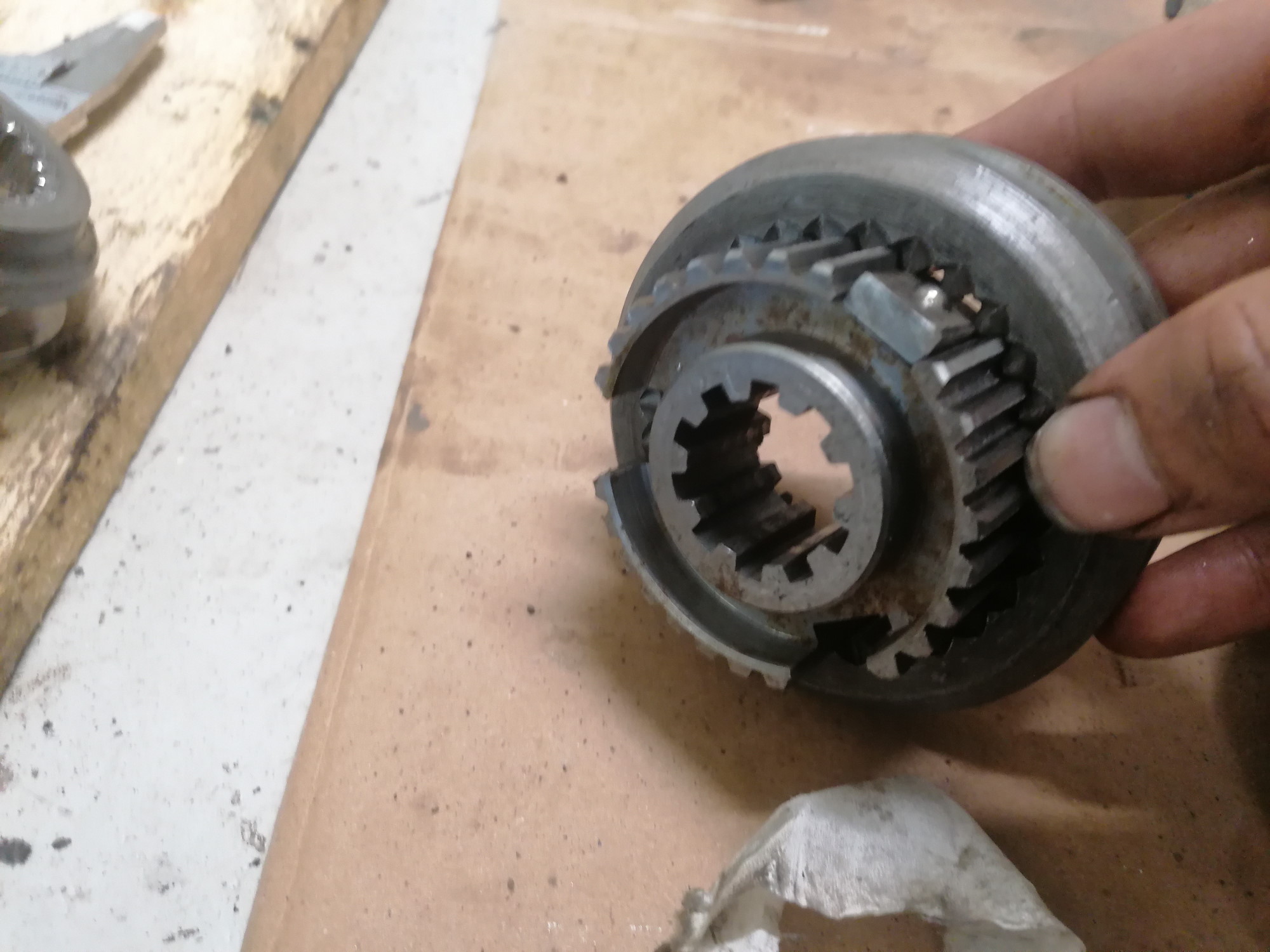 Sitten nelosvaihteen hyppimisen takia avasin laatikon ja synkrosta puuttui ihan pala, eli lootaremonttiin pääsee. Muutenhan tämän laatikko näyttää aika simppeliltä etenkin kun vain kolmos- ja nelosvaihteet on synkronoituja.