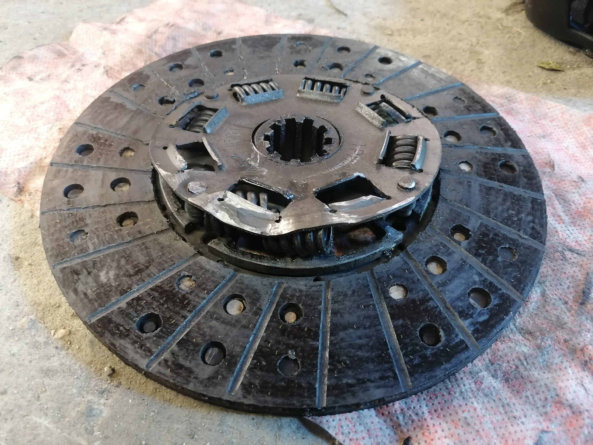 Vaihdelaatikon ja kytkimen kun irrotti niin paljastui särkynyt kytkinlevy. Niitit pettäneet parista kohtaa mutta muuten oli ihan ehjä ja pintaakin olisi vielä ollut vaikka kuinka. Painelaakeri ja asetelma oli ihan ehjiä eli pelkällä kytkinlevyn vaihdolla selviää.