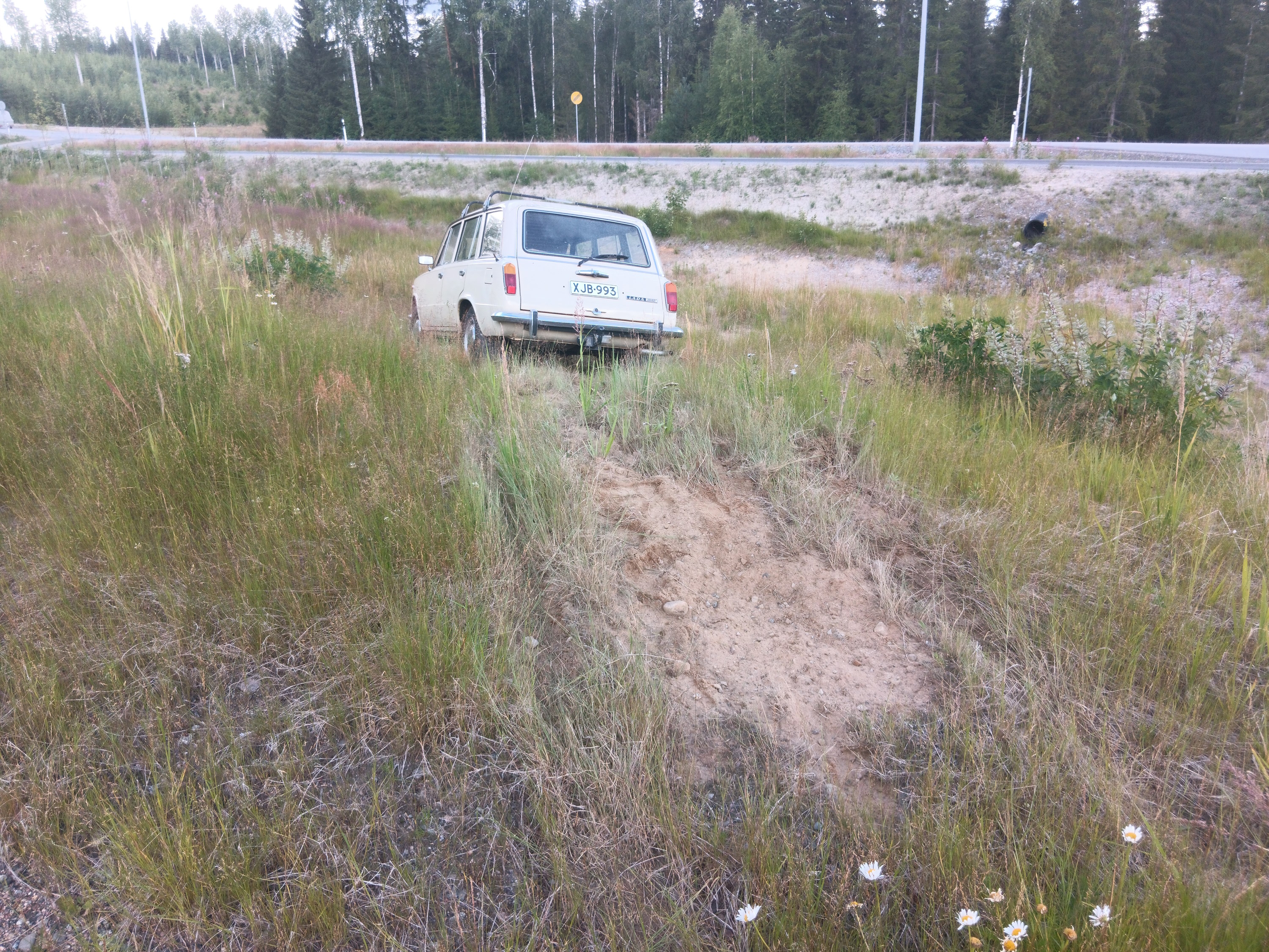 Nopealla vilkaisulla öljypohja lytyssä, puskuri mutkalla ja keulapelti hieman sisässä mutta muuten kori oli pysynyt muodossaan. Mullahan oli peräkontissa jonkinverran tavaraa, muunmuassa pyörä hajonneen tilalle ja sehän rytäkässä painoi takapenkin selkänojan banaaniksi ja pyörä vielä pomppasi takapenkille asti, että hyvä ettei tullut päähän.