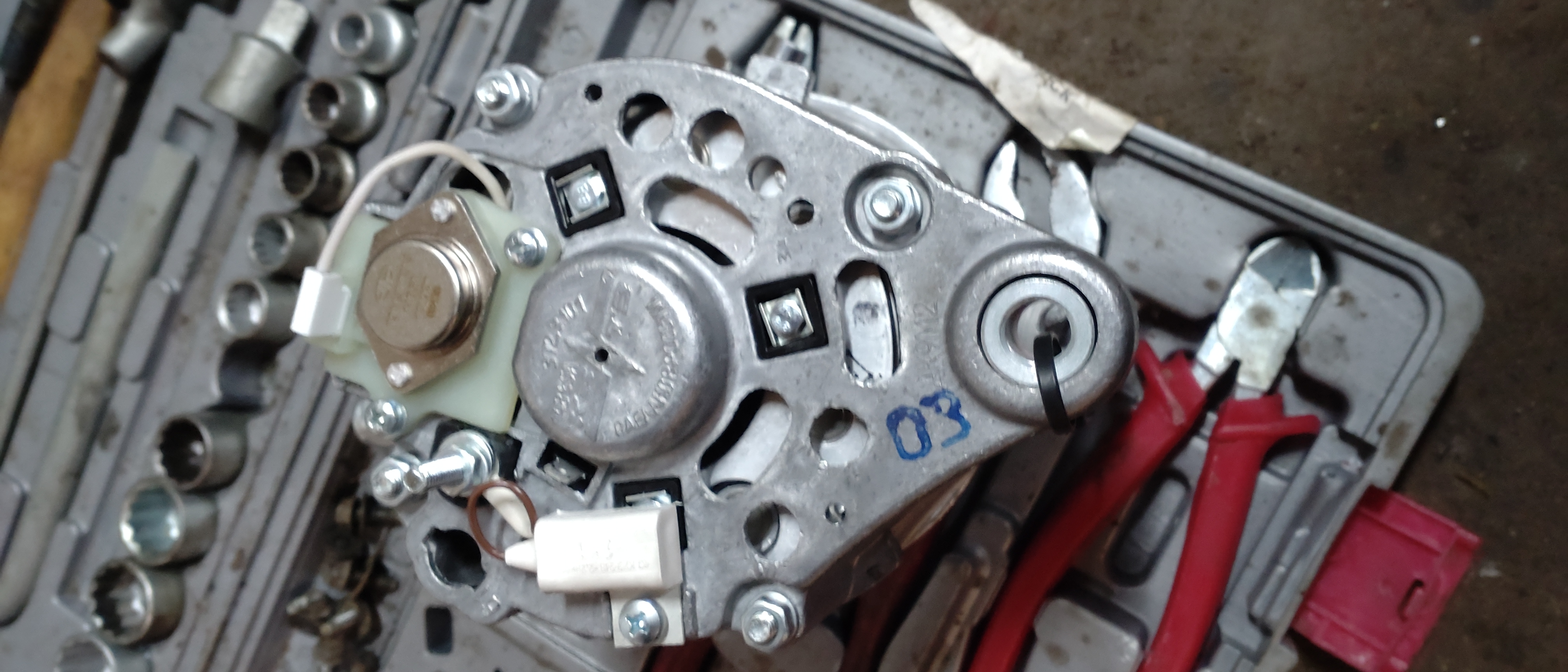 Seuraavana päivänä irrotin laturin ja se paljastui täysin loppuun ajetuksi. Kollektorin ylempi rengas on melkein kadonnut ja roottorissa on parin millin syvyinen ura kollektorin kohdalla. Täytyy siis hommata uusi laturi. Onneksi kaverilla oli riittävän toimiva laturi, jonka asensin nyt siirtymäajaksi. Uudeksi laturiksi aattelin laittaa tehokkaamman kuin vanhan.