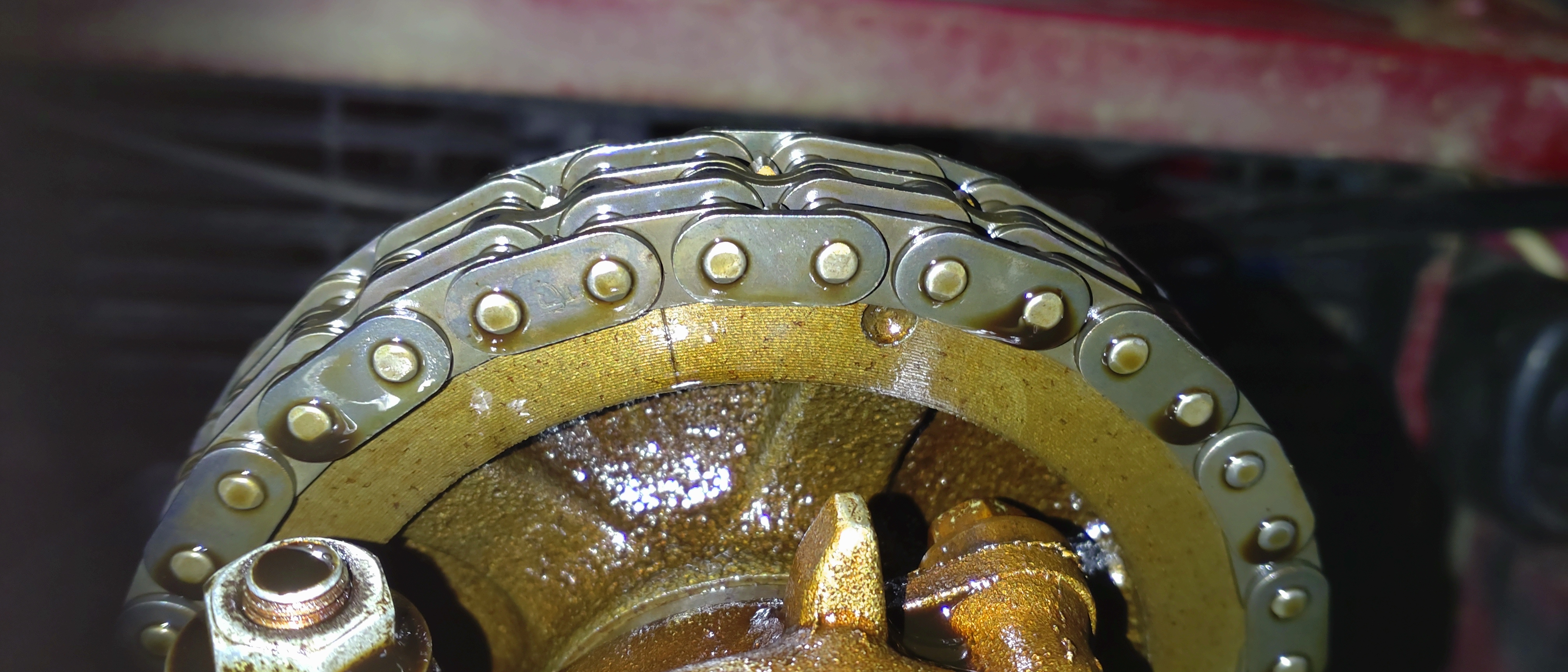 Siispä otin eilen Ladan työn alle. Venttiilikopan irrotuksen jälkeen pyörittelin jakopään merkit kohdakkain. Tässä kohtaa huomasin, että nokka-akselin merkki heittää pikkaisen ja nokka on myöhäisellä. Purin lisää jakopäätä ja ilmeni, että tässä on uudenmallinen jakopään kansi, 21214-alkuisella osanumerolla. Tässä on viisi sakaraa vastaamassa hihnapyörään, kun vanhemmassa kannessa on vain kolme sakaraa. Samalla sain valistusta, että tämä on tavallaan kulutusosa. Jos sakarat kuluvat liikaa, täytyy kansi uusia. Ilmeisesti tästä syystä on siirrytty tuohon viisisakaraiseen kanteen. Tämä nimenomainen kansi oli täysin kunnossa. Vain stefa kannattaa vaihtaa, vaikkei vanha vuodakaan. Kannen poistamisen jälkeen paljastuu jakopää. Kiristinkengässä ja ylälaahaimessa oli kulumisen jälkiä, muttei hälyttävässä määrässä. Olenhan kiristellyt ketjua aina säännöllisesti, joten tuhoa ei synny. Ketjun poistamiseksi täytyy irrottaa apuakselin hammaspyörä ja kampiakselin ketjupyörän vieressä oleva tatti, koska ketju ei mahdu poistumaan muutoin. Irrotin nokkapyörän ja laahaimet ja poistin ketjun. Vanha ketju oli uuteen verrattuna vääntyilevämpi ja kaikin puolin löysempi. Yhtään rullaa ei ollut hajonnut, mutta murtumilla olivat ne. Ketjurattaat olivat täysin kunnossa tässä koneessa.