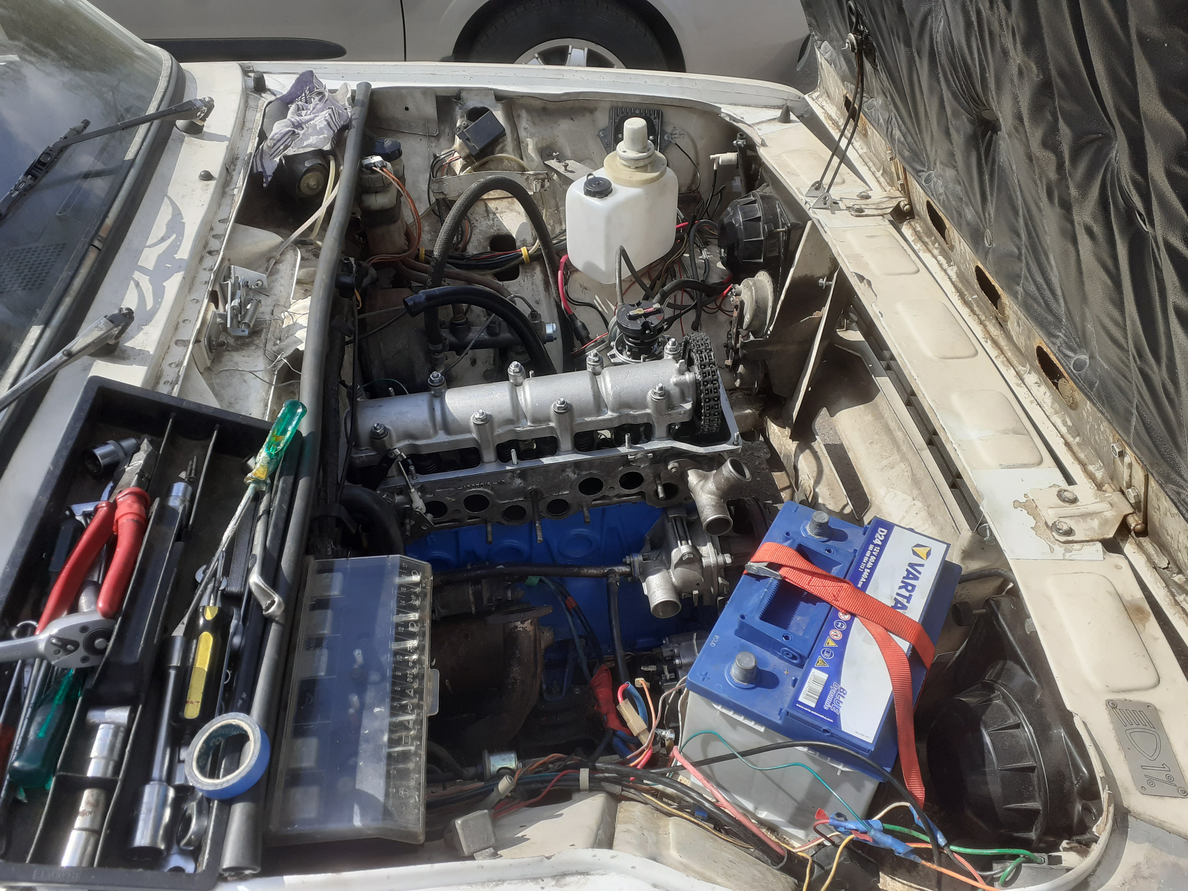 Tänään kävin pistämässä kasaan. Sen verta ehdin sitä kokeilla että: kone pyörii muttei meinaa lähtä käyntiin. Ampuu vaan kaasariin ja putkeen. Pitäisi kattoa nuo ajoitukset ja sytkä taas kuntoon. Tänään ei enään ehtinyt kun piti lähteä muihin hommiin. Katotaan missä vaiheessa ehdin taas puuhastelemaan tämän kanssa.