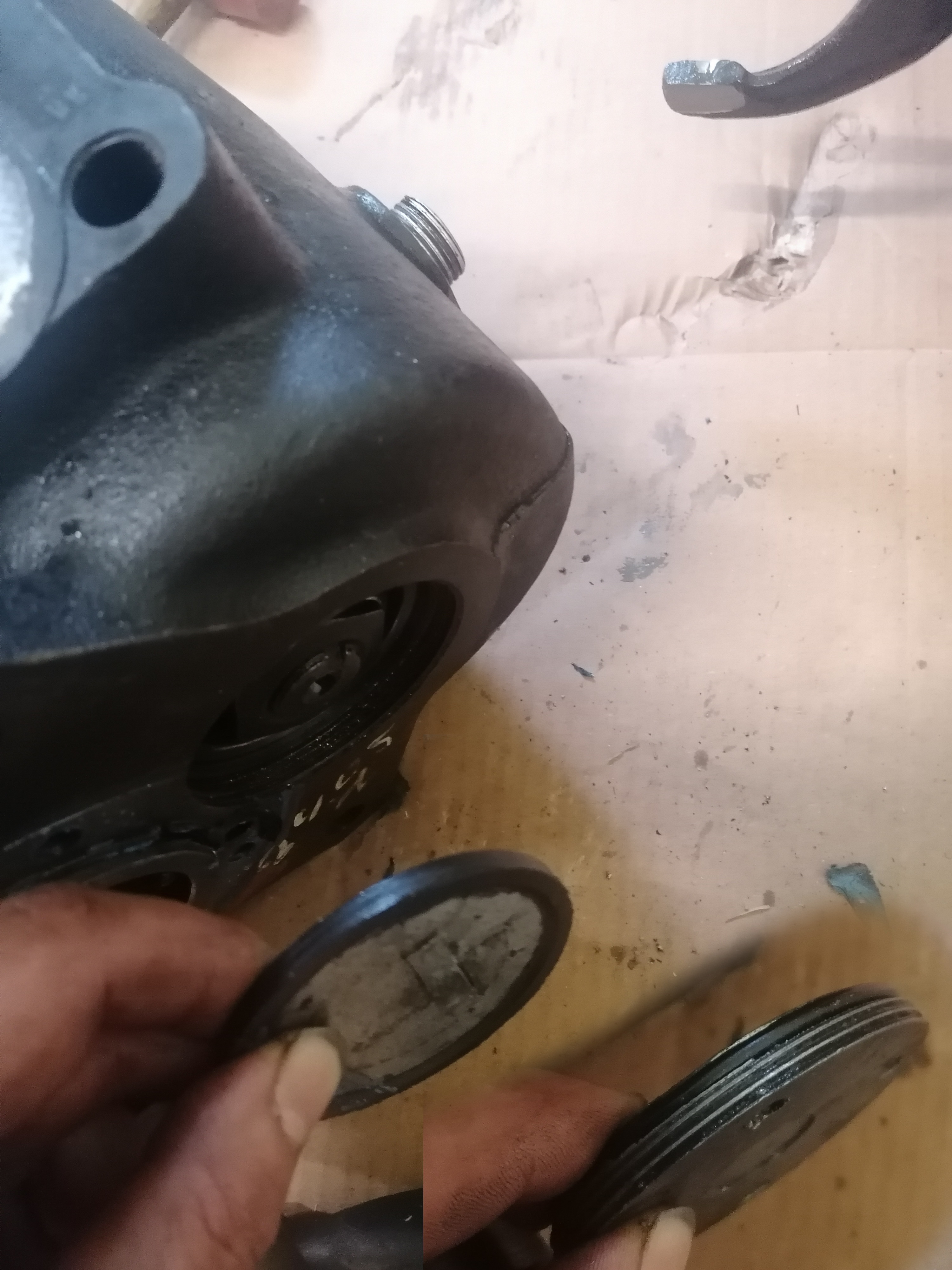 Sitten tuli pieni kommellus, kun piti saada moottori takaisin maanpinnalle. Moottori pysyi aika huterasti pystyssä ja vaati tiilen öljypohjan alle lisätueksi. No kun noston aika tuli niin mä vielä ajattelin että parempi hakea hanskat käteen ja samalla hetkellä kun mä päästin irti ja käänsin selän ni kaveri kanssa hellitti otettaan ja moottori rysähti lattialle, oltiin nimittäin jo ehditty ottaa se tiili pois. No meillä oli lattialla auton rengas vanteineen minkä päälle se moottori oli tarkoitus laskea ja sen päällehän se itsestäänkin osittain putosi , joskin venttiilikoppa edellä.