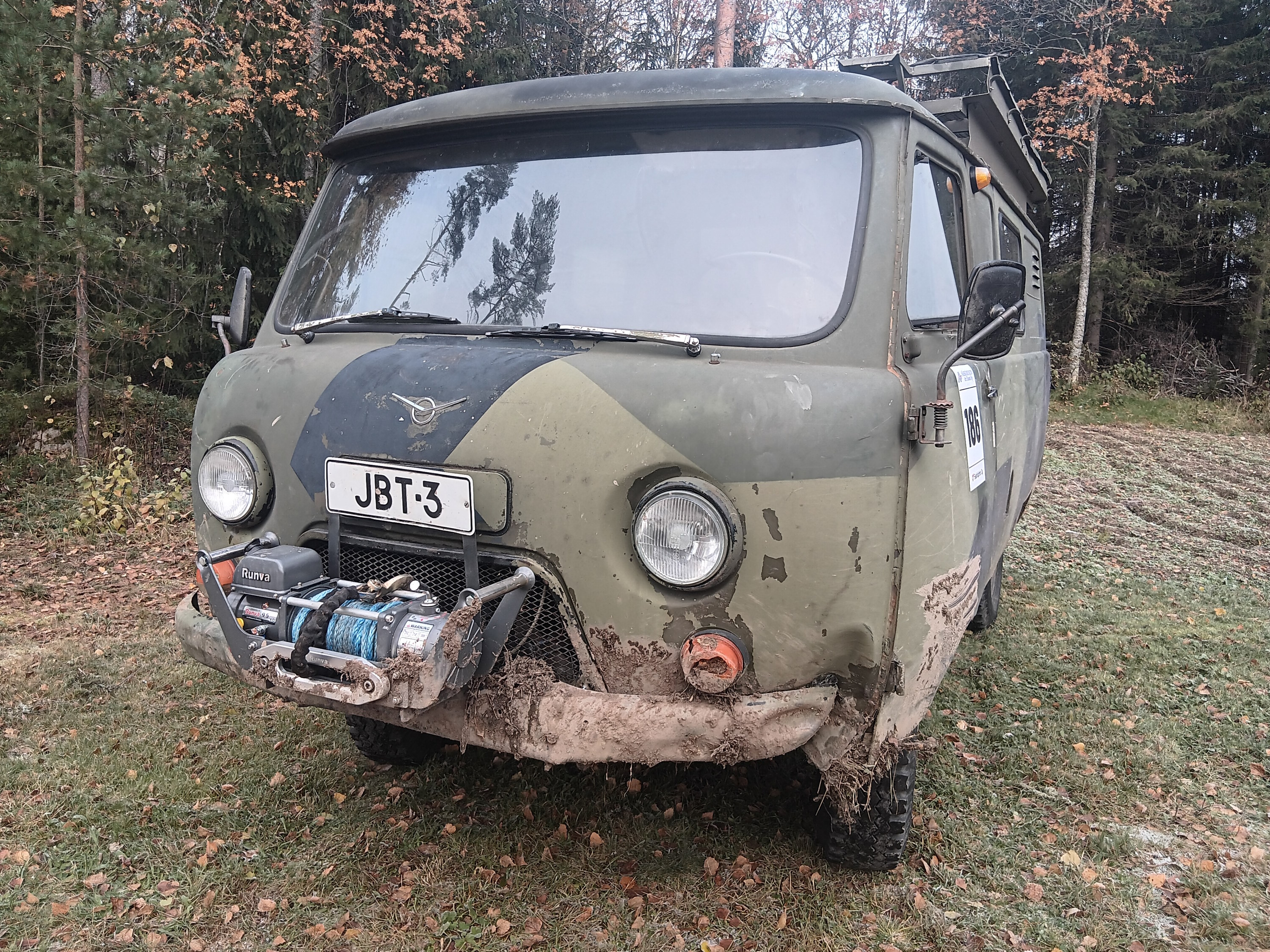 Ensimmäisellä metsälenkillä kopsahti etunurkka kiveen ja hieman etupuskurin alta peltiä lyttyyn. Takapuskurikin tarrasi johonkin puuhun sen verran kiinni että alkoi repsottamaan, joten se piti käydä seuraavalla varikkokäynnillä irrottamassa. Kauaa ei mennyt niin toiseltakin puolelta takapuskuri alkoi repsottamaan, vaan sitten ei enää päästykään varikolle asti, kun Uaz upposi akseleita myöten.