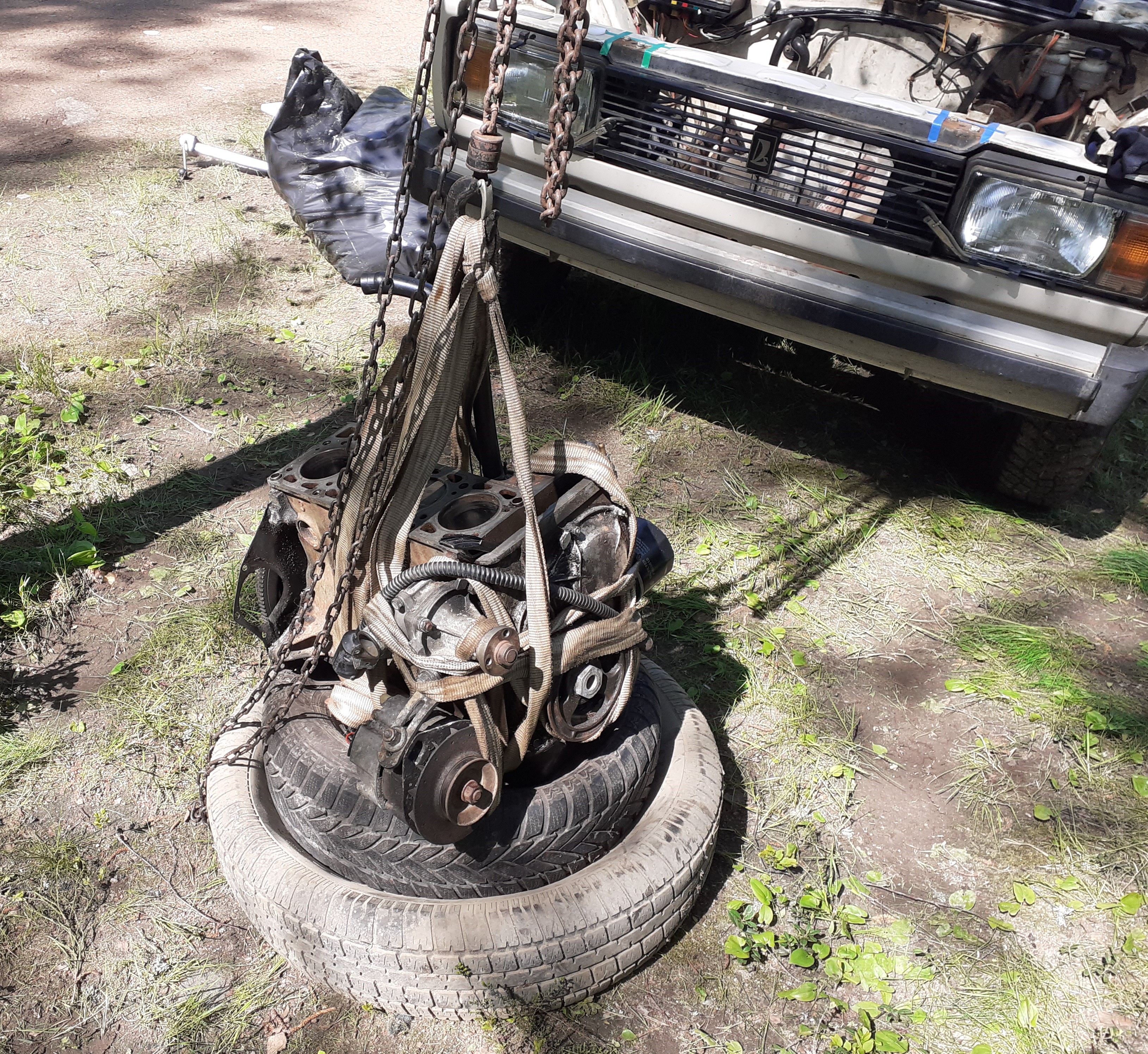 Kun kaikki tarvittava oli kasassa. Oli aika aloittaa työt. Työnsin auton kahden koivun väliin, puissa kiinni olevaan rautaputkeen laitoin taljan. Jonka avulla sitten nostin koneen pihalle. Suht helppo homma, loppujen lopuksi. Kunhan ei hätäile.